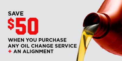 Valid on conventional, high mileage, or full synthetic oil changes plus an all-wheel alignment.